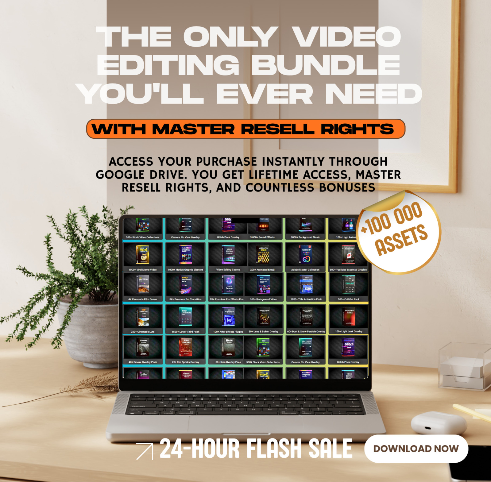 Get your copy of the All-In-One Video Editing Assets Bundle 3.0 and gain instant access to a world of creativity, professional assets, and profitable reselling opportunities.